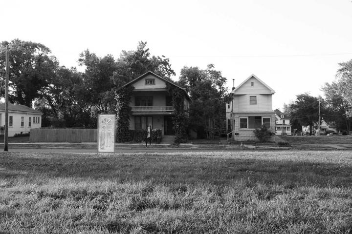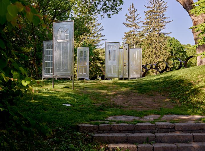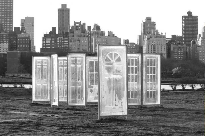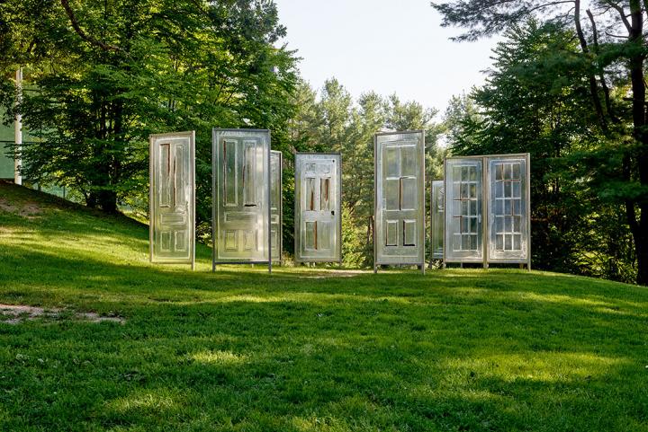 Translucent, vacuum formed casts of salvaged doors delineate the architectural floor plan of an absent apartment. One cast is embedded in the hillside. The installation emerges from the landscape as if revealed through a process of erosion.